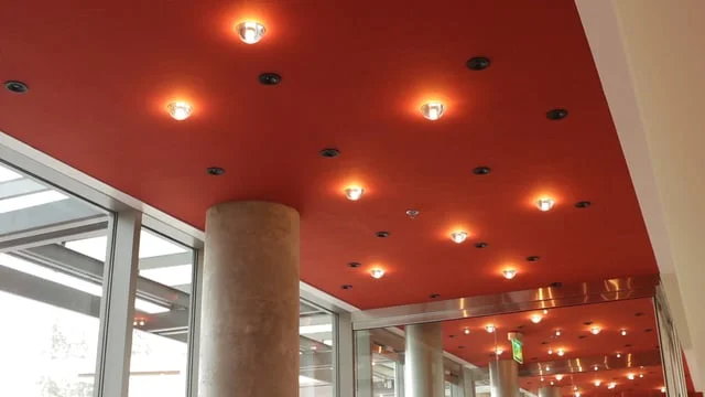 To achieve this effect, a weather station, mounted onto the roof of the building, continuously captures changes in the weather. The resulting data stream, containing wind speed, temperature, precipitation, and sunlight, is parsed by a Node.JS server we wrote and output as OSC to a PureData patch, which subsequently triggers musical sounds that playback through around one hundred speakers mounted into the lobby's ceiling.